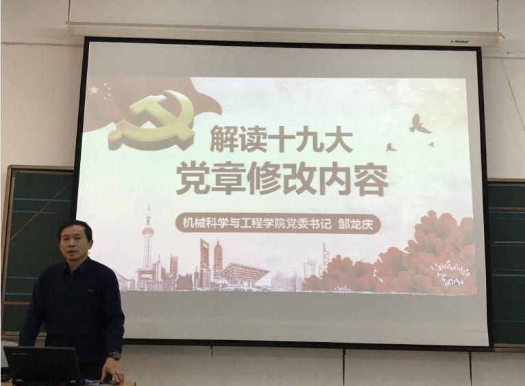 ,2007so太阳集团党委书记邹龙庆同志在机电馆509给全院教工党员做了“解读十九大对《中国共产党章程》内容修改”的专题讲座,有74名教工党员聆听了本次讲座。