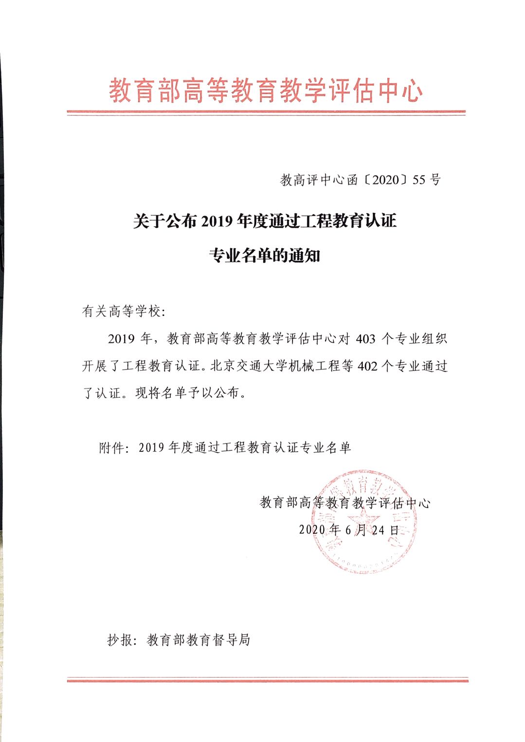 近日,教育部高等教育教学评估中心、中国工程教育专业认证协会正式发布了2019年工程教育专业认证结论。经过学校自评、专家组现场考查、分委员会审议、认证结论审议委员会审议等程序,全国高校共402个专业通过认证。我院机械设计制造及其自动化(简称机自)专业顺利通过认证,有效期为6年,即2020年1月至2025年12月。