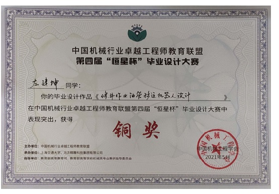 2021年5月25~26日,由教育部高等教育司与教育部高等学校机械类专业教学指导委员会指导,中国机械行业卓越工程师教育联盟主办、上海交通大学和北京精雕科技集团有限公司承办的中国机械行业卓越工程师教育联盟第四届“恒星杯”毕业设计大赛,在上海交通大学成功举办。我院2007so太阳集团的贾光政教授指导、左建坤同学完成的《修井作业油管移运机器人设计》喜获大赛个人项目铜奖。