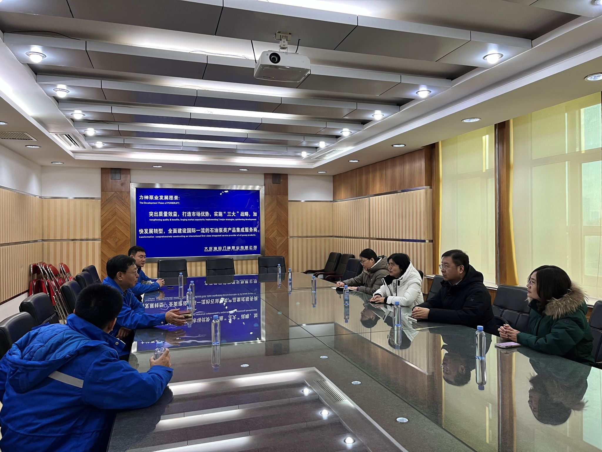 在大庆力神泵业有限公司,总经理唐延兵对王素玲院长一行来访表示热烈欢迎,唐延兵介绍了公司基本情况、主要业务方向和产品,带领参观了电潜泵、螺杆泵、井下电机的加工、装配及检验中心,并就企业对应用型人才需求提出了建议。王素玲院长详细介绍我院高端油气装备智能制造现代产业学院基本情况,就学院在产业学院建设目标、建设内容、人才培养特色举措等方面开展的探索进行讲解。双方就产业学院的人才培养目标、课程体系设置、实践教学安排、与企业的产学研合作等方面进行了深入交流。并就理念融合、师资融合、科研融合、课程融合、实践教学融合等五个融合方面达成合作共识。