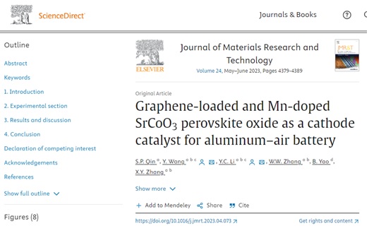 我院2020级硕士研究生秦善鹏在国际期刊《Journal of Materials Research and Technology》(IF=6.40,SCI top期刊)上发表题为“Graphene-loaded and Mn-doped SrCoO3 perovskite oxide as a cathode catalyst for aluminum–air battery”的研究论文(DOI:https://doi.org/10.1016/j.jmrt.2023.04.073)。