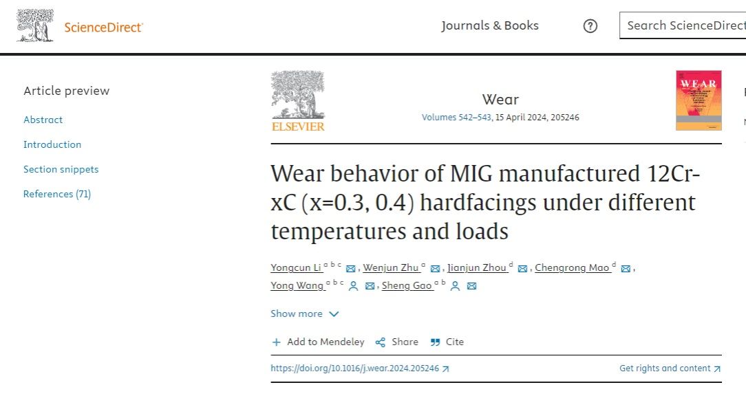 我院2021级硕士研究生朱文俊在《Wear》(IF=5.0,中科院一区top期刊)上发表题为“Wear behavior of MIG manufactured 12Cr-xC (x=0.3, 0.4) hardfacings under different temperatures and loads ”的研究论文。(DOI:https://doi.org/10.1016/j.wear.2024.205246)。