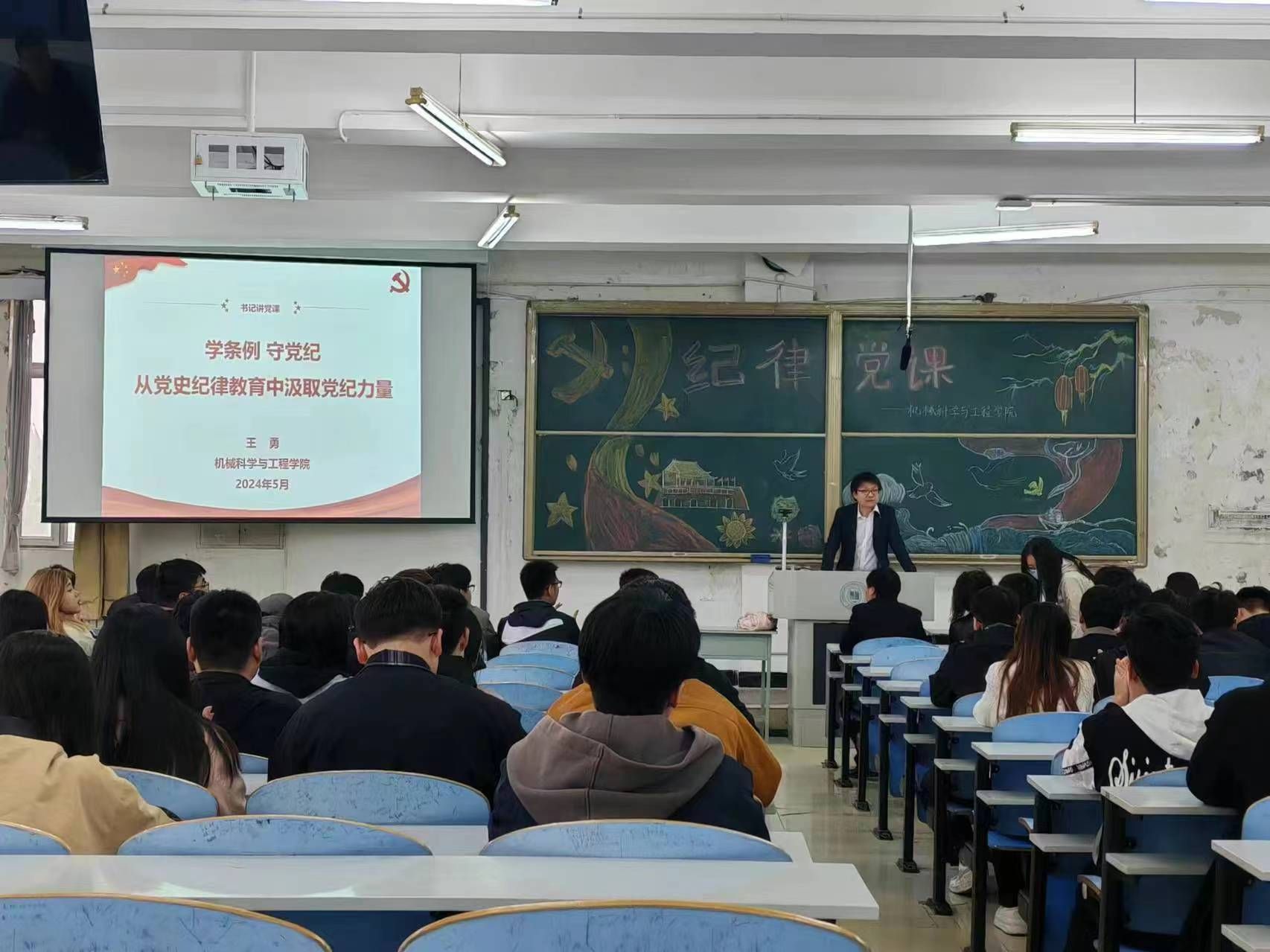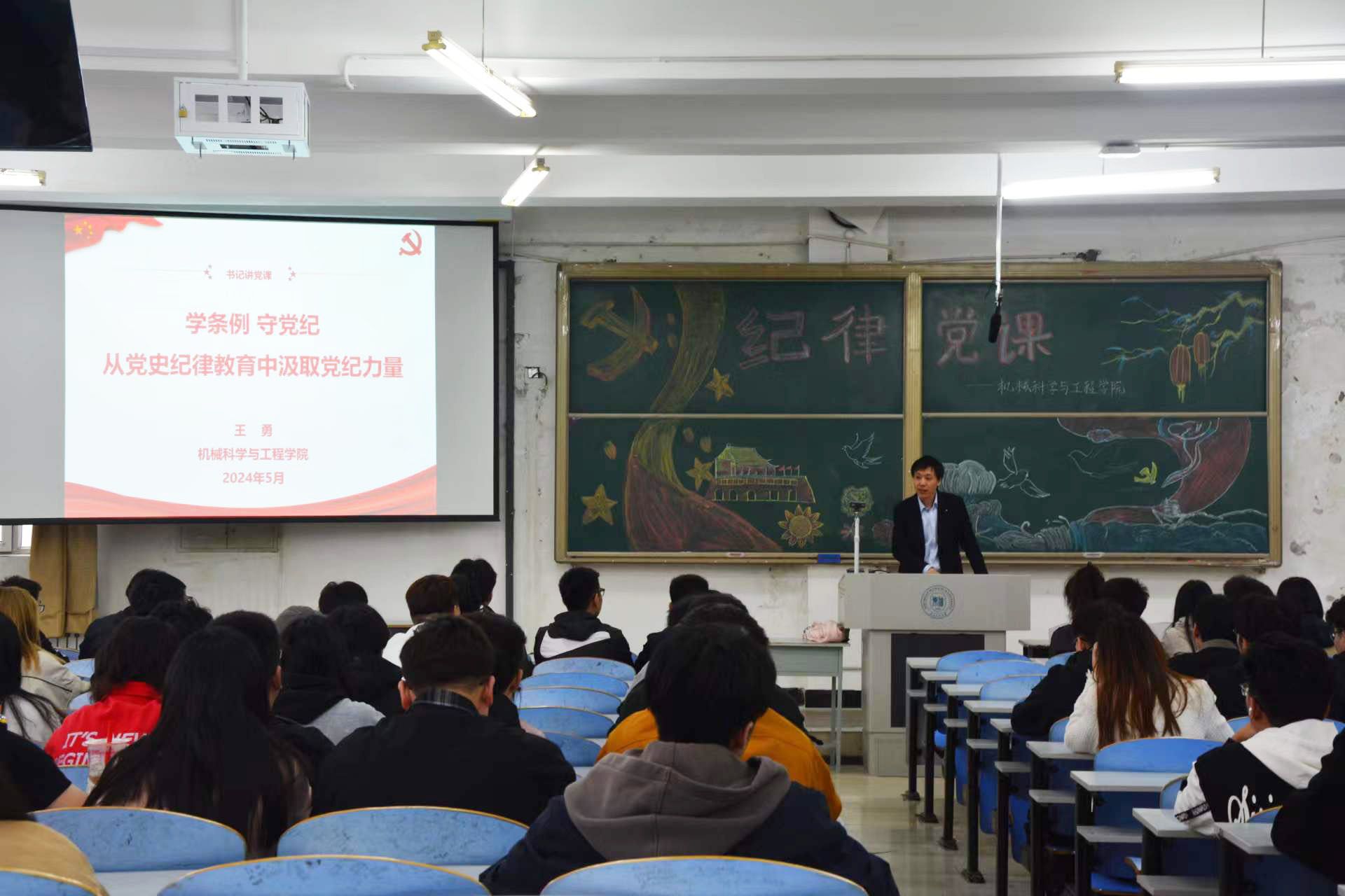 为深入学习贯彻修订后的《中国共产党纪律处分条件》,教育引导党员学纪、知纪、明纪、守纪,推动党纪学习教育入脑入心,2024年5月10日,学院党委书记王勇以“学条例 守党纪----从党史纪律教育中汲取党纪力量”为题,为全院200多名师生党员上了一堂生动的专题党课。专题党课由学院党委副书记、纪委书记闫超主持。