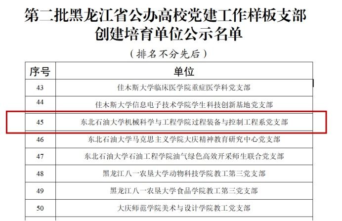 近日,黑龙江省委教育工委公示了第二批黑龙江省公办高校党建“示范创建”名单,我院过程装备与控制工程系党支部获批黑龙江省公办高校党建“样板支部”培育创建单位。