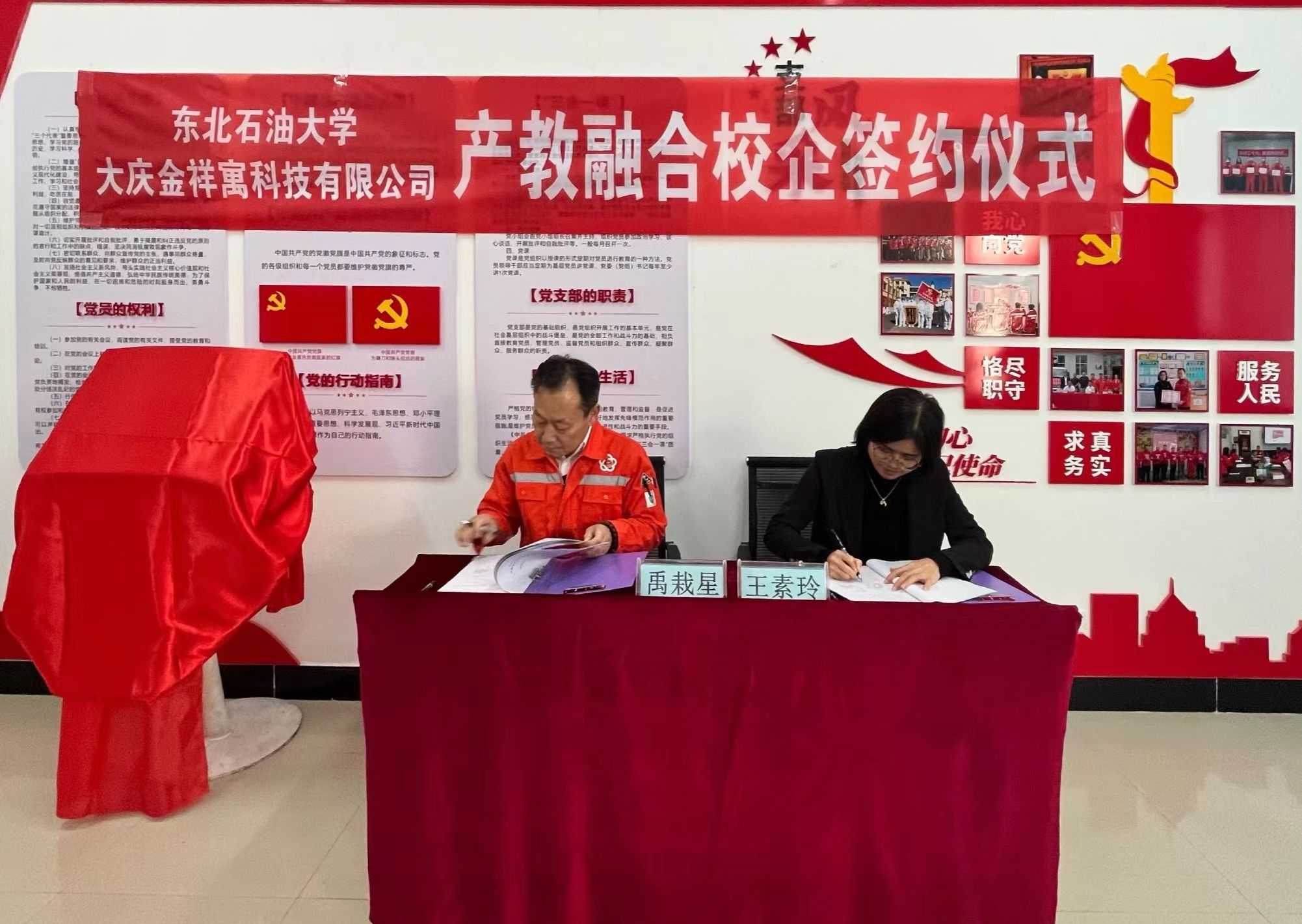 院长王素玲与大庆市金祥寓科技有限公司董事长禹载星共同签署研究生产教融合实践基地协议并为基地揭牌。学院党委书记王勇、正处级辅导员王业贤、基地指导教师徐金超以及金祥寓科技有限公司总经理黄国全、副总经理张楠楠、各岗位负责人等参加仪式。